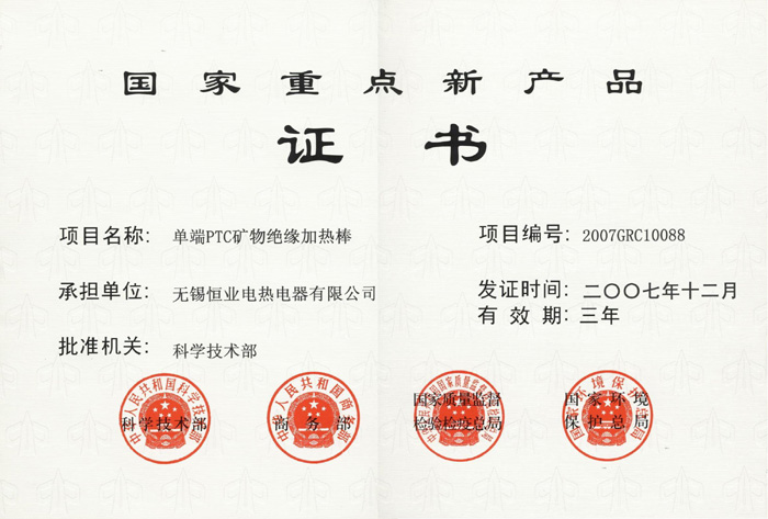 上一篇: 單端PTC礦物絕緣加熱棒高新技術產品認定證書